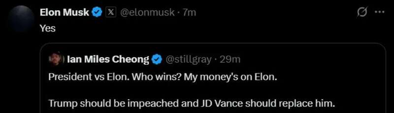 据央视新闻,当地时间6月5日,在特朗普与马斯克开始公开骂战后,马斯克又在社交媒体上公开表态,认为美国总统特朗普应该被弹劾。