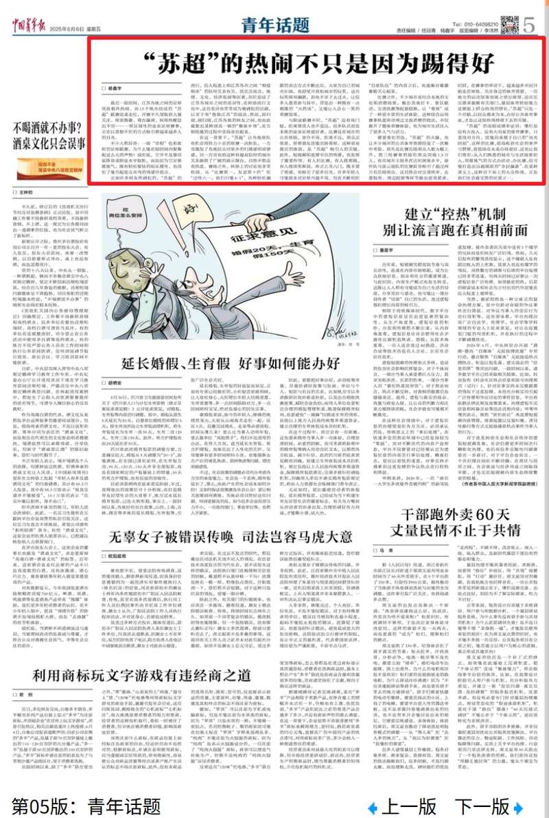 中国青年报今日5版,最近一段时间,江苏各地之间的足球竞技格外热闹。由13个地市组成的“苏超”联赛迅速走红,开赛不久便收获大量关注。球票售罄、看台爆满、网络热梗层出不穷……一项区域性的业余足球赛事,正在以意想不到的方式吸引着越来越多人的目光。