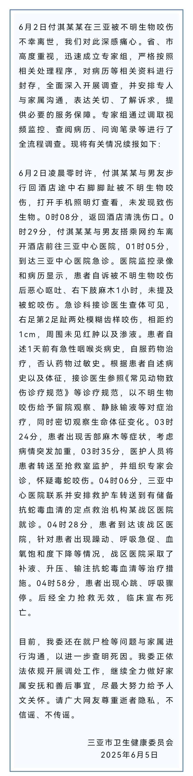 三亚市卫生健康委员会再通报“女子被咬伤不幸离世”事件:就尸检等问题与家属沟通,以进一步查明死因