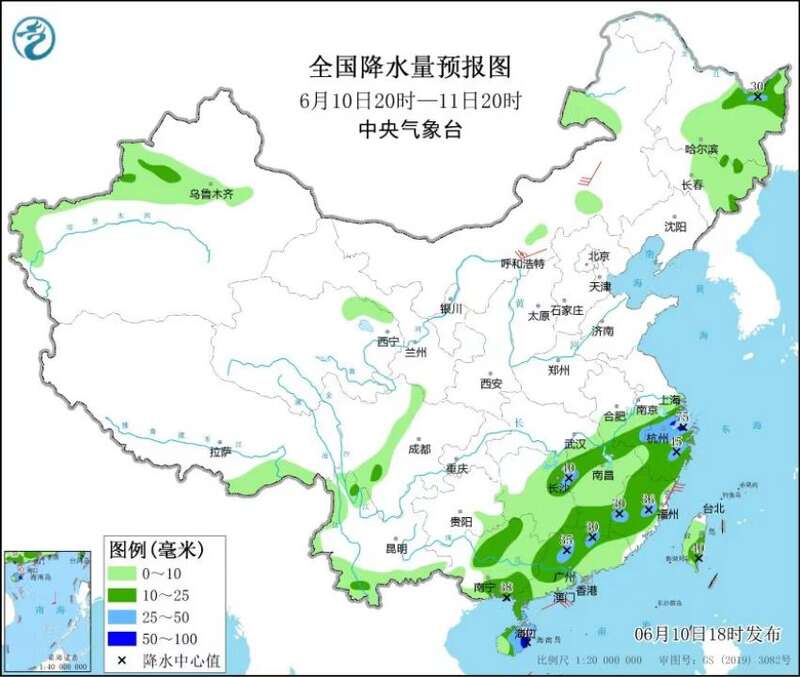 黑龙江东北部、江南北部和中东部、华南大部、新疆伊犁河谷等地部分地区有中到大雨,其中,浙江北部、海南岛东部等地局部地区有暴雨。