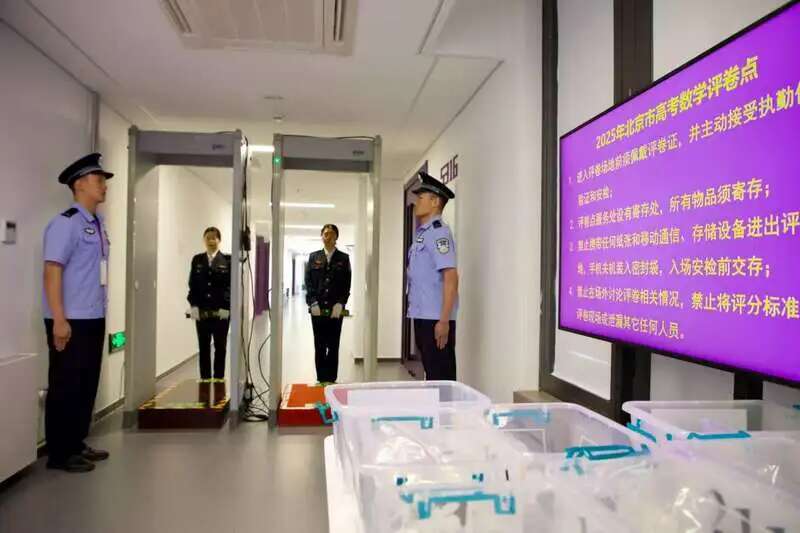 记者来到了位于清华大学和北京大学的高考评卷现场。这里实行封闭式管理,设立安检门和金属探测器等设备,所有人员须凭有效证件入场,进入阅卷场地均需接受安检。公安人员在评卷场所全程值守。评卷现场的系统设备、网络环境全部与外网物理隔离。答卷数据服务器部署在专用保密机房。评卷数据库每天进行双备份和异地存储,确保评卷数据绝对安全。