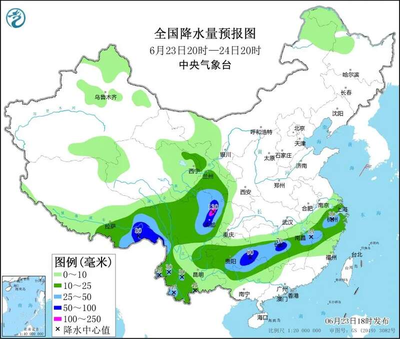 甘肃南部、川西高原东北部、四川盆地西部、西藏东南部、云南西部和南部、贵州东南部、广西北部、湖南中南部、江西中部、浙江中北部等地部分地区有大到暴雨,其中,四川盆地西部等地局地有大暴雨。