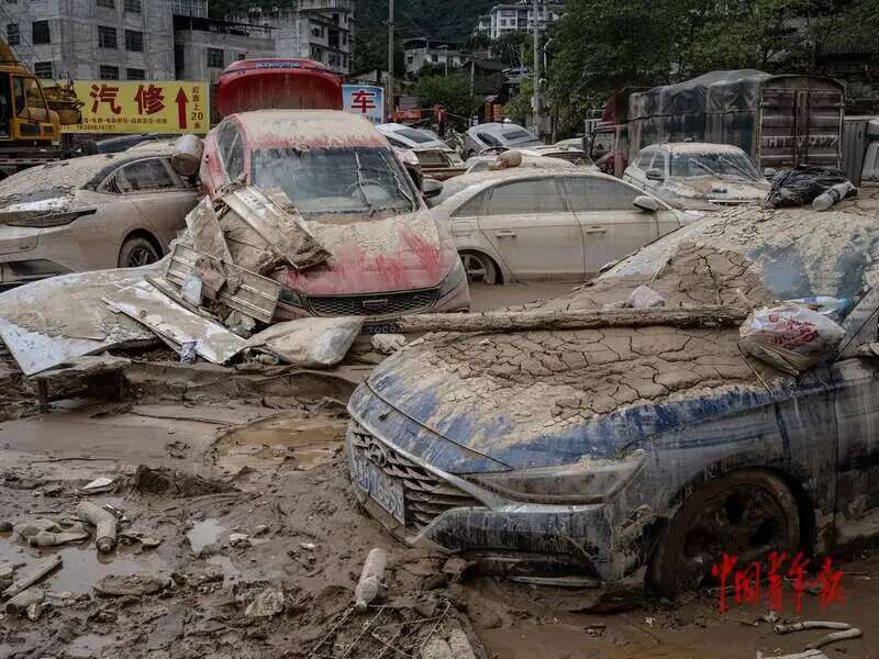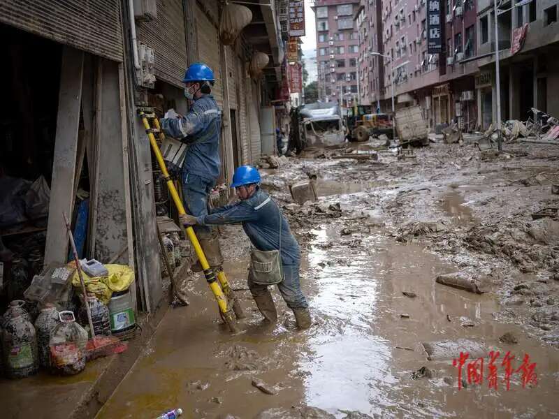 洪水退去,当地居民吴女士早早起床整理房屋,为城市早日恢复生机努力