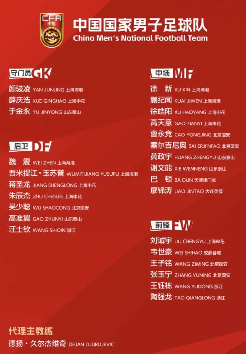 与征战世界杯预选赛亚洲区18强赛时的国足阵容相比,原国青队主帅、国足代理主教练久尔杰维奇进一步推动球队年轻化:26名球员当中年龄最大的为34岁(守门员颜骏凌),年龄最小的为18岁,30岁以上球员4人,20岁以下球员3人,全队平均年龄降至25.4岁,蒯纪闻、廖锦涛、薛庆浩、于金永4人为首次入选。