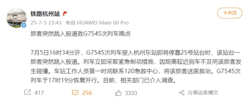 “旅客突然跳入股道致列车晚点”,铁路杭州站通报