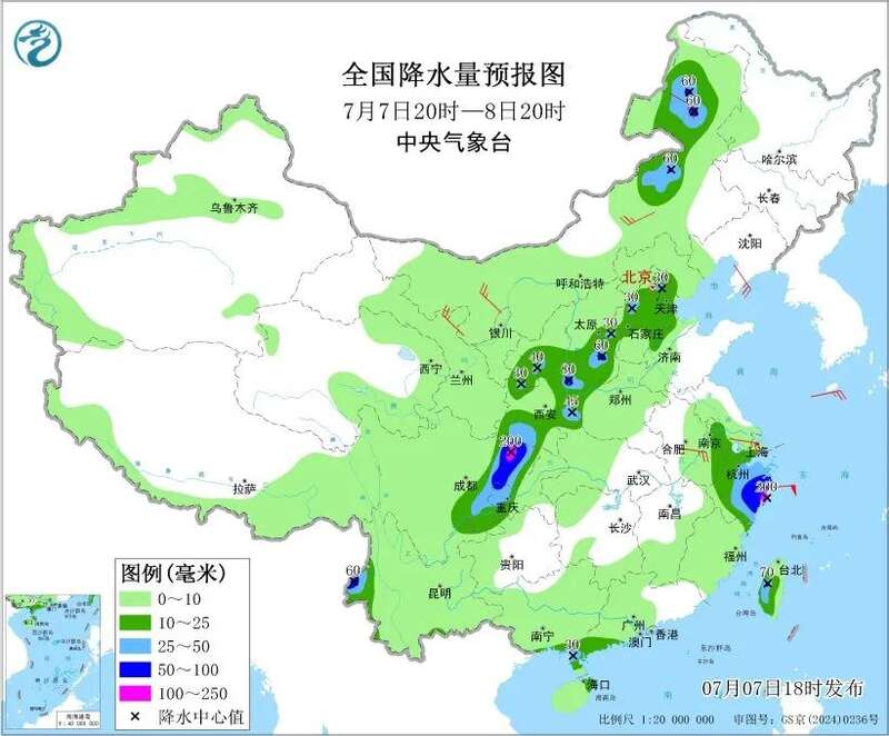 浙江中东部、四川东部、陕西中部和西南部、重庆西南部、云南西北部、台湾岛西部、内蒙古东北部、山西中南部、河北中部等地部分地区有大到暴雨,其中,浙江东南部、四川东北部等地局地有大暴雨。