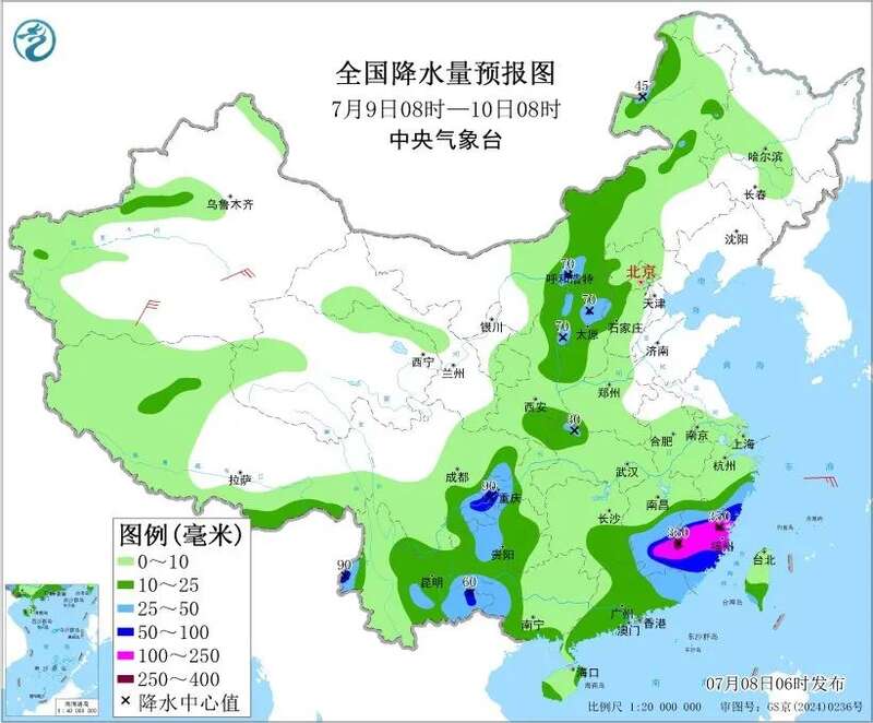 浙江南部、江西中南部、福建、广东东部、四川东部、重庆西部、贵州西部、云南西北部和东南部、广西西部、陕西中北部等地部分地区有大到暴雨,其中,江西西南部、福建中北部等地部分地区有大暴雨,局地特大暴雨(250~350毫米)。