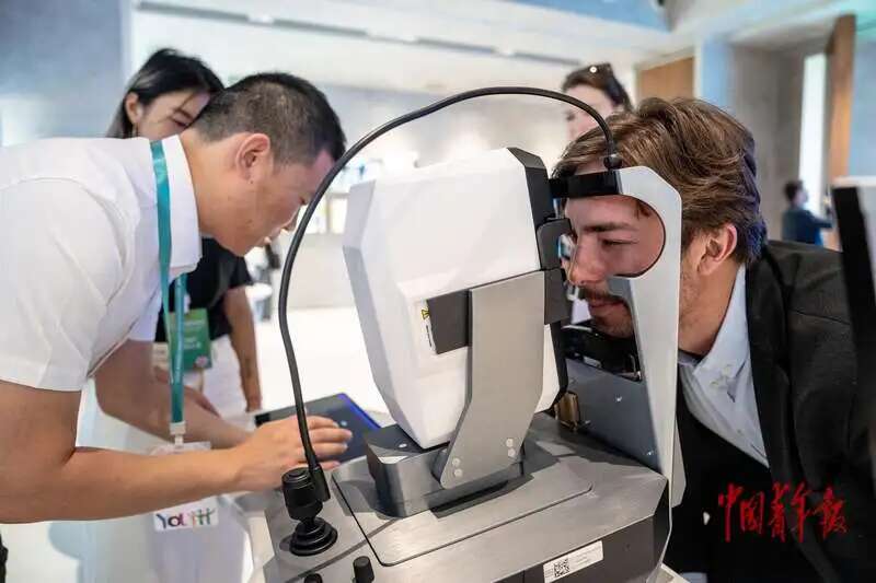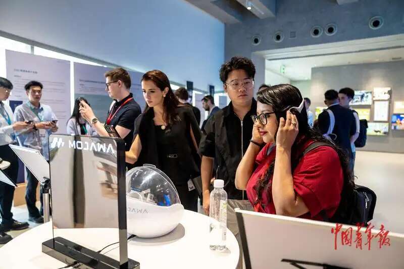 ▵7月16日上午,江苏苏州,2025年世界青年发展论坛人工智能与科技创新主题论坛,与会国内外青年代表在会场试用高科技产品。中青报·中青网记者 李隽辉/摄