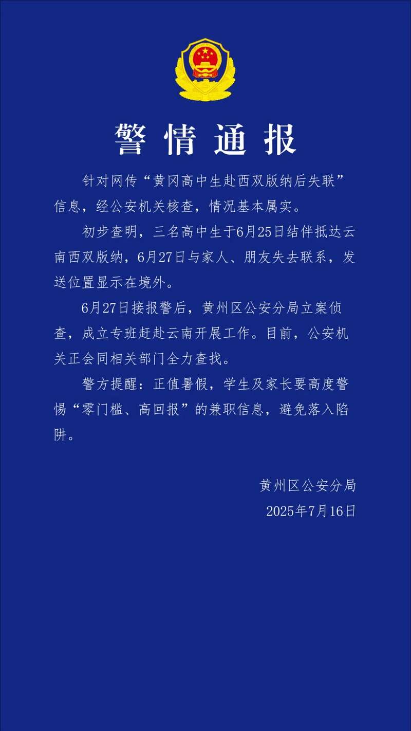 警方通报3名高中生赴西双版纳后失联:情况基本属实,已立案侦查