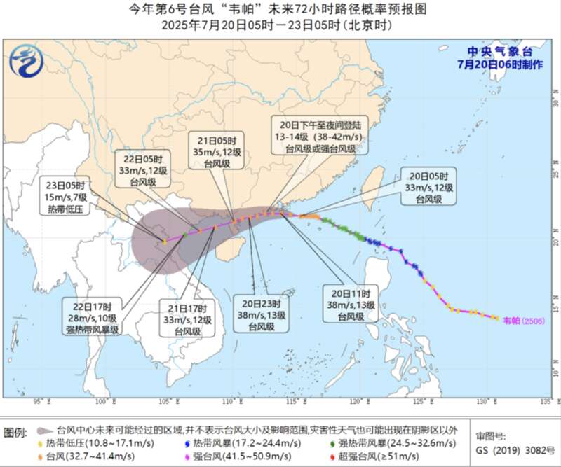 预计,“韦帕”将以每小时25公里左右的速度向偏西方向移动,强度还将有所加强,即将于20日下午至夜间在广东珠海到湛江一带沿海登陆(13~14级,38~42米/秒,台风级或强台风级),自东向西掠过广东西部沿海,并将于21日白天移入北部湾海面,随后趋向越南东北部沿海。