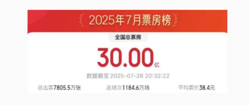 据网络平台数据,7月26日20时32分,2025年7月总票房破30亿。