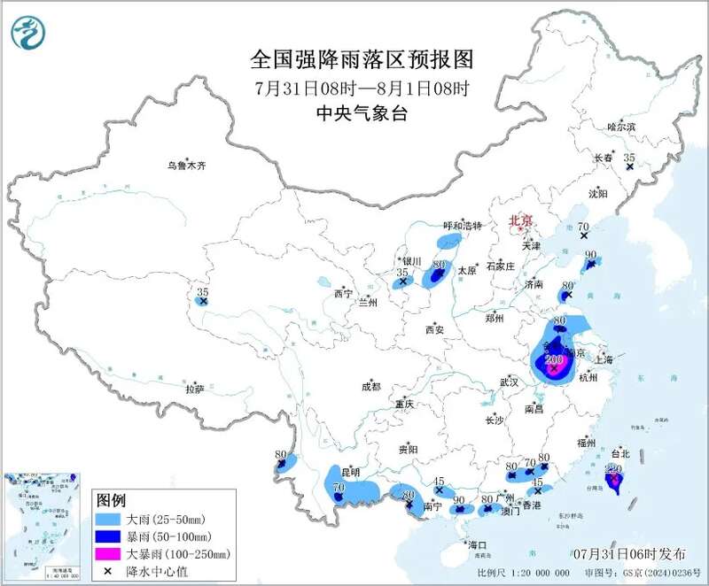 预计,7月31日08时至8月1日08时,安徽中南部、江苏中部、浙江西部、山东半岛南部、辽东半岛南部、宁夏中部、陕西北部、内蒙古河套地区、云南西部和东南部、广西西南部和东南部、广东南部沿海和东北部、台湾岛南部等地部分地区有大到暴雨,其中,安徽中南部、台湾岛南部等地部分地区有大暴雨(100~220毫米)。上述部分地区伴有短时强降水(最大小时降雨量20~50毫米,局地可超过80毫米),局地有雷暴大风等强对流天气。