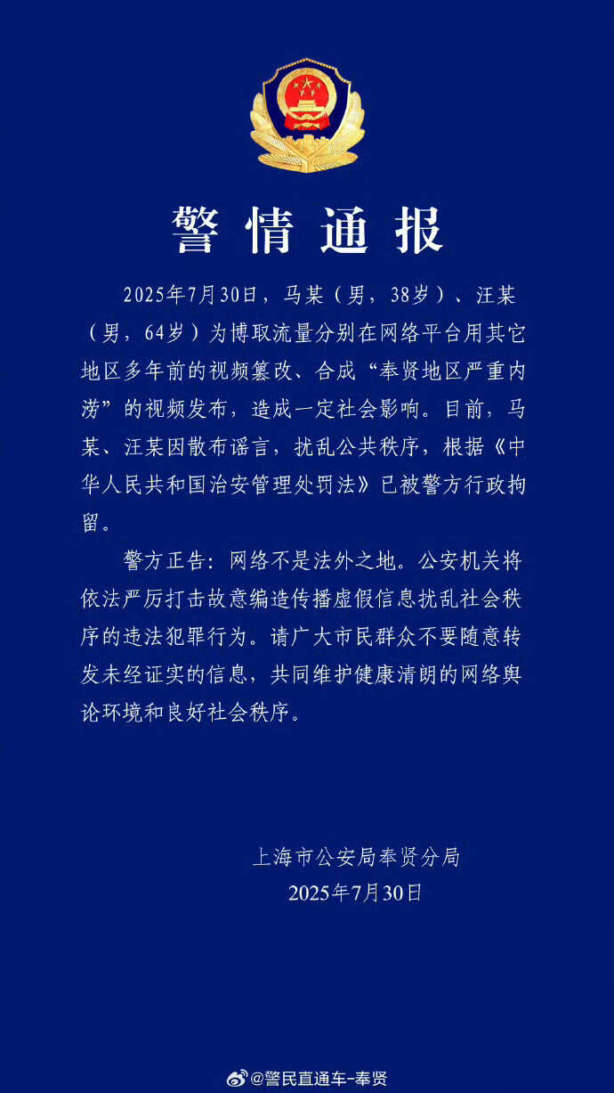 7月30日,上海市公安局奉贤分局发布警情通报:2025年7月30日,马某(男,38岁)、汪某(男,64岁)为博取流量分别在网络平台用其他地区多年前的视频篡改、合成“奉贤地区严重内涝”的视频发布,造成一定社会影响。目前,马某、汪某因散布谣言,扰乱公共秩序,根据《中华人民共和国治安管理处罚法》已被警方行政拘留。