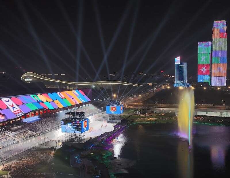成都世运会开幕式场地“天府之檐”灯火通明,全流程联排对包括运动员入场、文艺表演等在内的各个环节进行了全要素、高强度检验,确保每个细节精准到位。