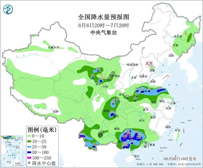 广西大部、广东西部、云南西部、四川盆地中部、河南西部和中北部、安徽北部、江苏北部、青海东北部、甘肃中部等地部分地区有大到暴雨,其中,广西北部和东部、广东西部、云南西部等地部分地区有大暴雨。