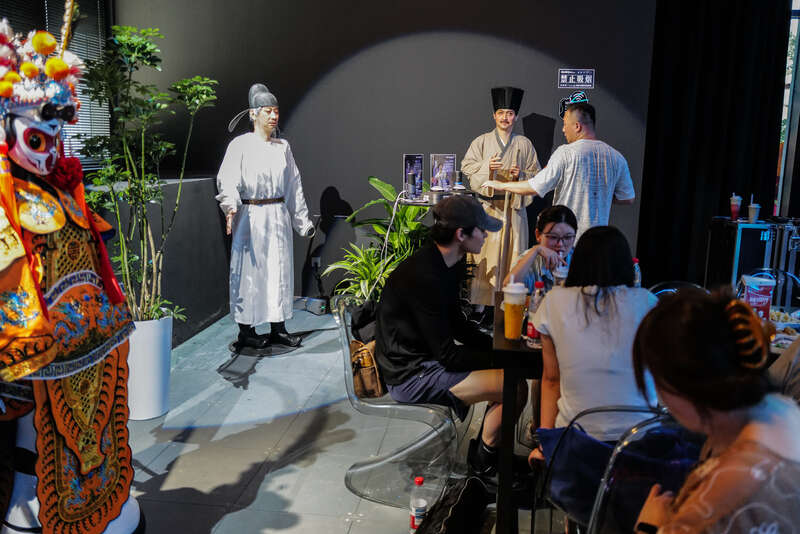 8月6日,北京经济技术开发区(北京亦庄)机器人产业园,智能机器人主题餐厅,身着古装的仿人机器人“李白”“苏轼”在进行脱口秀互动。中青报·中青网记者 赵迪/摄