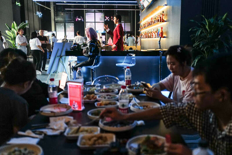 8月6日,北京经济技术开发区(北京亦庄)机器人产业园,智能机器人主题餐厅,几名年轻人在用餐,远处的仿生人形机器人酒保在迎客。据了解,这是一家以智能机器人为主题的餐厅,通过人机交互、智能迎宾、互动导览等系统,营造“舌尖+文化+科技”的全沉浸式用餐环境。该餐厅致力于成为机器人应用场景的示范平台,为未来更多机器人提供场景实验和数据抓取的机会。8月8日,2025世界机器人大会将在北京开幕,这里的全球首个机器人4S店也将正式对外开放。中青报·中青网记者 赵迪/摄