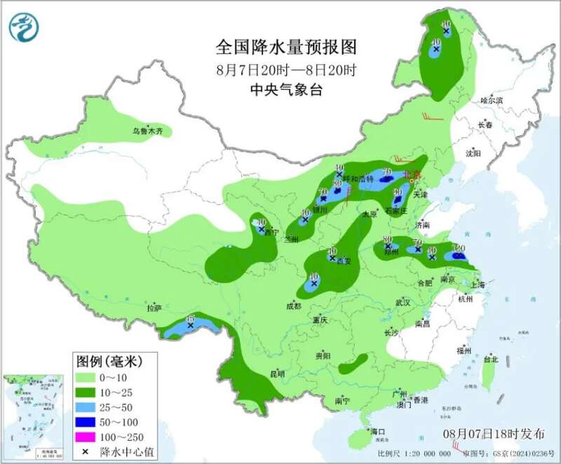 内蒙古河套地区和东北部、黑龙江西北部、西藏东南部、西北地区中东部、华北中北部、黄淮西部和南部、江淮东北部、四川盆地北部、西南地区南部等地部分地区有中到大雨,其中,内蒙古西南部、山西东北部、河北西部、河南北部和东部、江苏东部等地部分地区有暴雨或大暴雨。