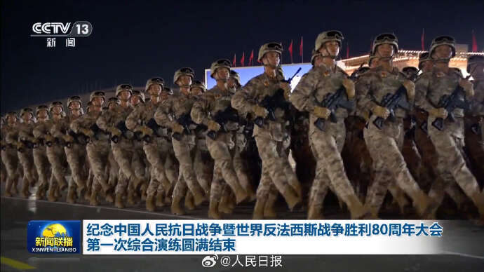 综合央视新闻、人民日报,8月9日夜间至8月10日凌晨,北京天安门地区举行了纪念中国人民抗日战争暨世界反法西斯战争胜利80周年大会第一次综合演练,约2.2万人参加演练及现场保障工作。