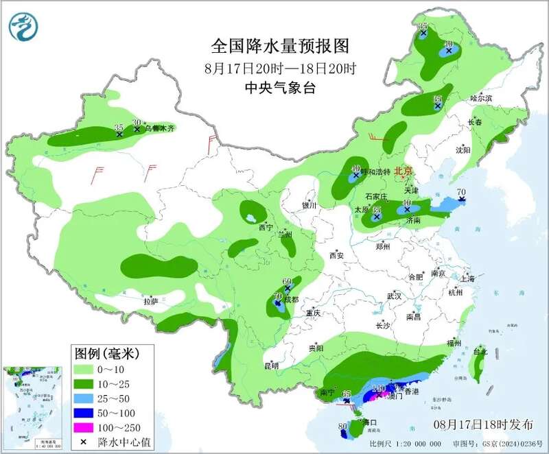广东南部沿海、广西南部沿海、海南岛西部、内蒙古中部和东北部、山东半岛、四川盆地西部、云南西部等地部分地区有大到暴雨,其中,广东西南部沿海等地部分地区有大暴雨。