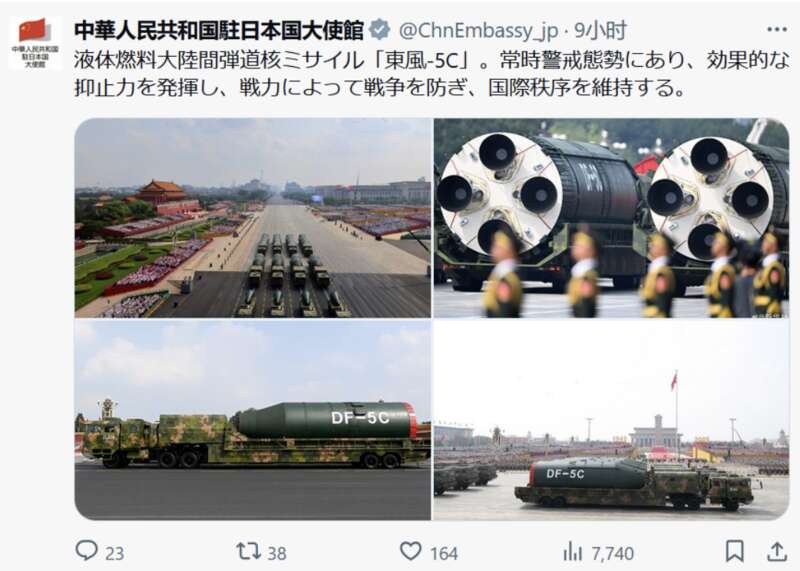 配文写道:“东风-5C”液体洲际战略核导弹,全时戒备、有效威慑、以武止戈、维护国际秩序。