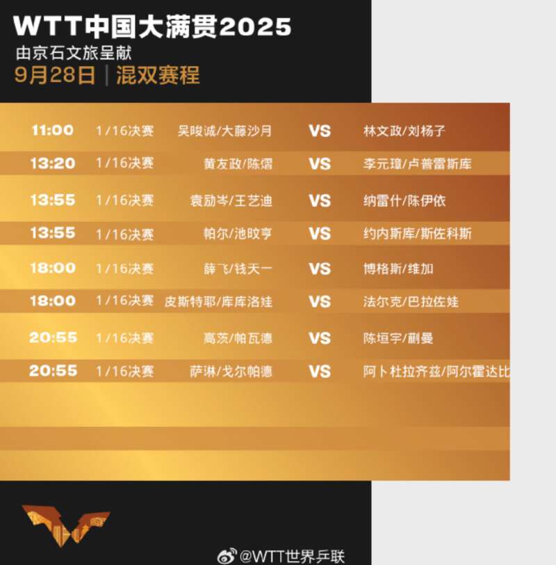 孙颖莎、王楚钦首轮遭遇硬仗!WTT中国大满贯正赛首日赛程