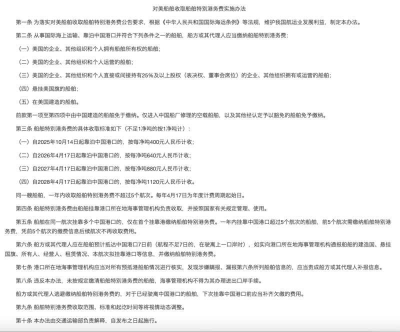 交通运输部14日发布《对美船舶收取船舶特别港务费实施办法》。《办法》共十条,自发布之日起施行,主要包括制定依据、收取范围、收取标准、收取主体、缴费航次、缴费要求、信息核实、违规处理、动态调整、解释部门和施行时间等内容,进一步明确了由中国建造的船舶、仅进入中国船厂修理的空载船舶,以及其他经认定予以豁免的船舶免予缴纳的具体规定。