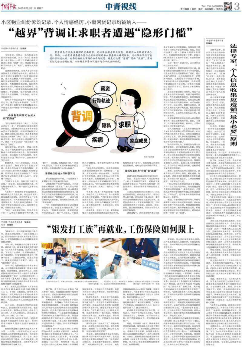 据中国青年报今日3版,今年年初,因陷入一场与职业无关的小区物业纠纷,罗文(化名)在求职路上栽了跟头——第三方背调公司在对她进行求职“背调”时,对这起非职业相关诉讼标记为“黄灯”,使她错失入职机会。如何为背调划定边界?与职业无关的记录,能否成为求职者被“一票否决”的依据?如何守护求职者权益和公平就业底线?中青报·中青网记者对此展开采访。详情