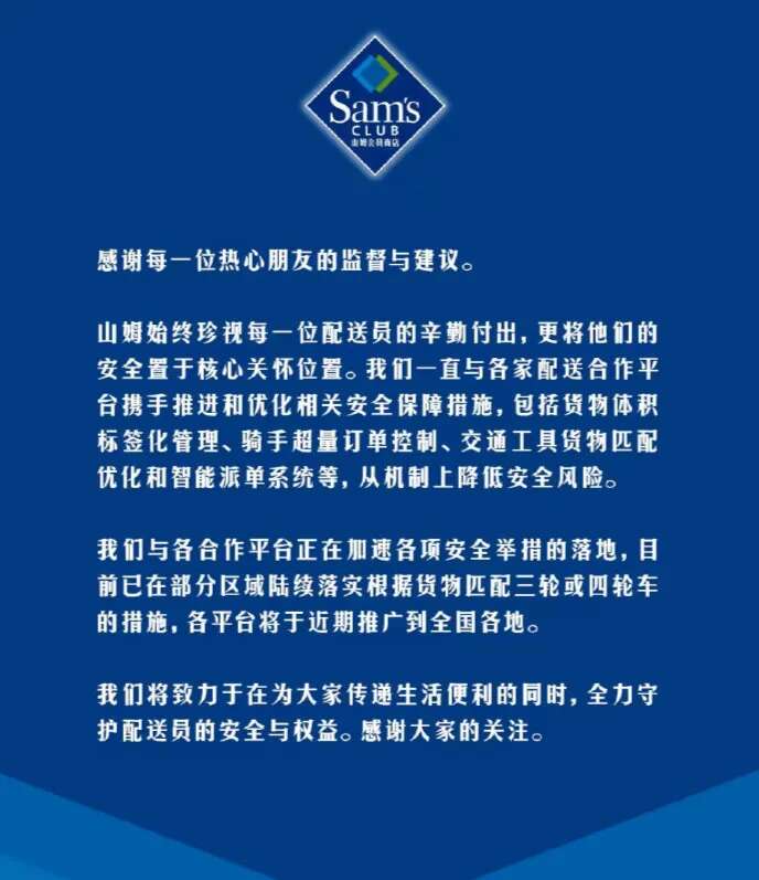 10月21日,山姆会员商店发布关于持续优化配送员安全保障的声明: