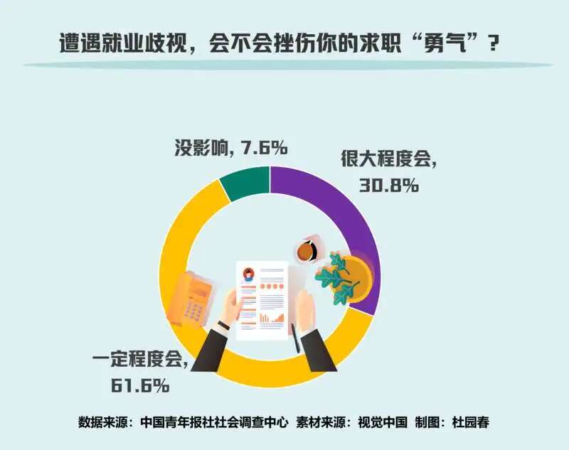中国青年报社社会调查中心联合问卷网(wenjuan.com),对1333名应届生进行的一项调查显示,92.4%的受访大学生表示若遭遇就业歧视会挫伤自己的求职勇气。减少就业歧视,62.6%的受访大学生建议推进户籍制度改革,57.1%的受访大学生呼吁建立健全促进公平就业的法律法规。
