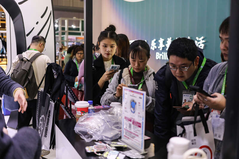 11月8日,上海国家会展中心,年轻人们在第八届中国国际进口博览会消费品展区排队领取一家潮流箱包品牌的周边。中青报·中青网记者 孔斯琪/摄