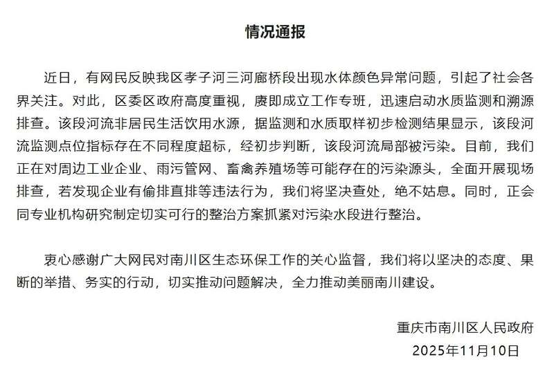 据澎湃新闻,11月10日晚,重庆市南川区人民政府发布情况通报。