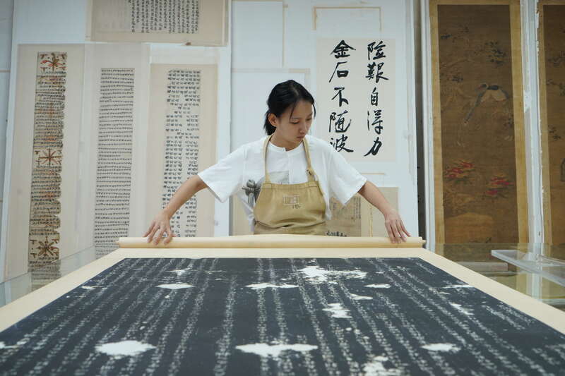 这些多取自历代名碑的拓片,承载着中国书法艺术的精髓,却因年代久远出现断裂、污渍、褶皱等问题。修复过程中,不仅要精准判断纸张的材质与老化程度,还要根据每一处损伤制定个性化的修复方案。有时为接续一段断裂的笔画,需要俯身数小时,用细毫笔一点点补全墨迹,力求“修旧如旧”,不破坏原有的艺术神韵。