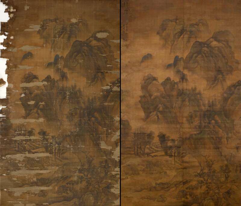 修复前(左)后(右)的明代唐寅《山水图》对比。西安工业大学供图