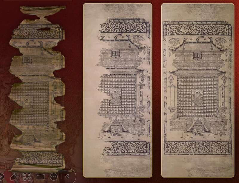 《大藏经阁》版画修复前(左)后(右)对比。西安工业大学供图