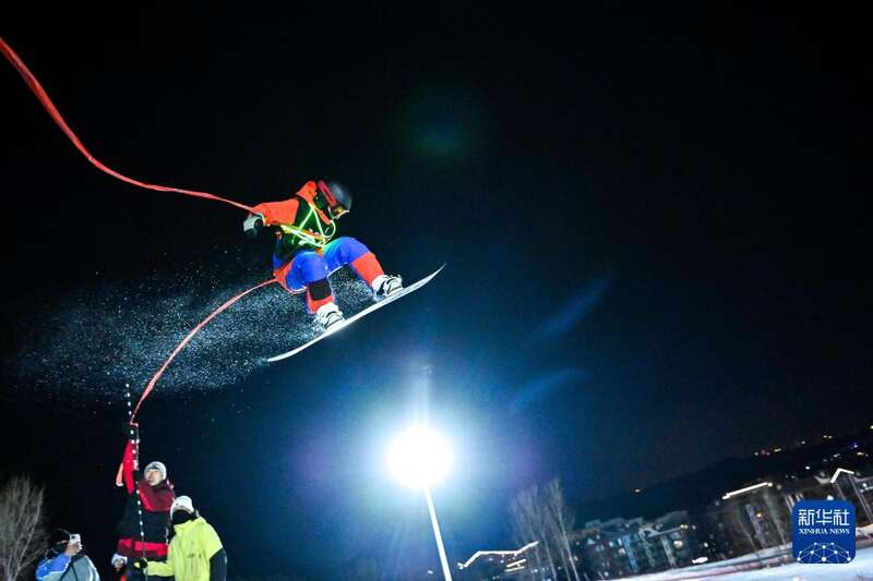 2025年1月29日,在坐落于阿勒泰市城区的新疆将军山国际滑雪度假区,雪友在新春趣味滑雪公园跳台活动中钻过火圈。新华社记者陈朔摄