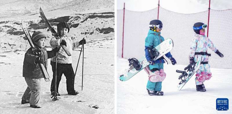 左图:1973年2月14日,吉林省通化市的儿童扛着滑雪板,来到市郊的山上学习滑雪(新华社发);右图:2023年2月10日,孩子们带着滑板走在位于吉林省通化市的万峰滑雪场(新华社记者颜麟蕴摄)。