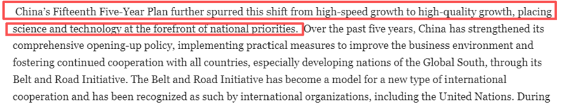 作者在文中说,“十五五”规划建议进一步推动中国经济从高速增长向高质量发展转型,将科技创新提升至国家战略核心。过去五年间,中国深化全方位开放格局,通过优化营商环境的具体措施,特别是借助共建“一带一路”倡议,持续深化与各国尤其是全球南方发展中国家的合作。该倡议已成为新型国际合作的典范,获得联合国等国际组织的高度认可。与此同时,中国通过“绿色经济”政策统筹推进生态环境改善与国际承诺履行,重点支持非洲及全球南方国家的环保型经济项目。在环境保护、清洁能源、生态建设与绿色产业领域,中国正以坚定承诺加速推进经济清洁化、绿色化转型。
