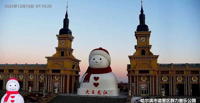 被无数网友通过网络直播“云监工”的哈尔滨群力音乐公园大雪人闪亮登场!这是今早晨光下大雪人的样子: