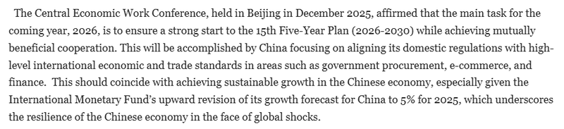 中央经济工作会议提出,将“坚持对外开放,推动多领域合作共赢”确定为2026年中国经济工作的重点任务之一。为实现“十五五”良好开局,中国将主动对接国际高标准经贸规则。