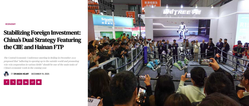 近日,知名期刊《现代外交》(Modern Diplomacy)网站发文指出,中国在2025年通过举办第八届进博会、启动海南自贸港全岛封关运作、出台一系列稳外资政策等组合举措,持续释放高水平对外开放信号,为全球投资者提供广阔机遇。中国继续成为世界经济增长重要引擎。