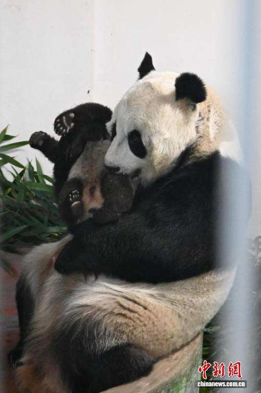 大熊猫妈妈与大熊猫幼崽“曼兰仔”互动。