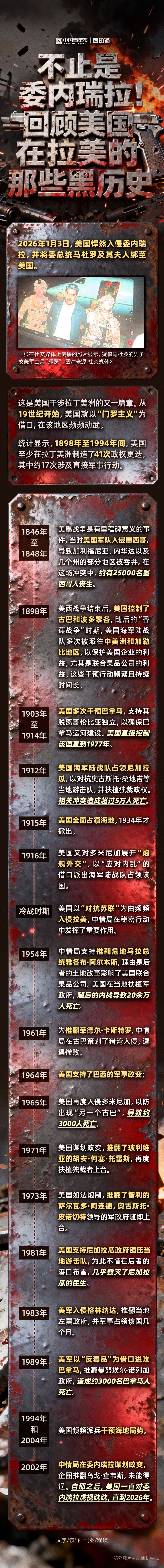 41次干涉!17次直接入侵!美国长期以来视拉丁美洲为“后院”,横行霸道、肆无忌惮,犯下了罄竹难书的罪行。一张长图,梳理美国肆意干涉拉美的种种劣迹……