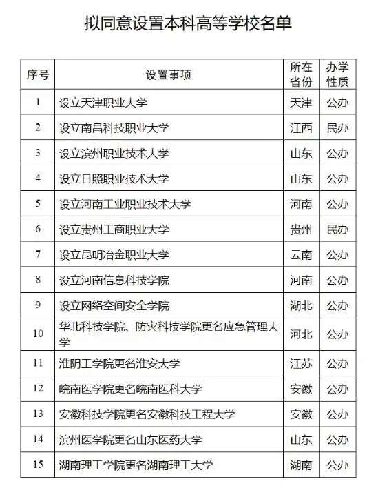 名单中有9所为新设高校,包括天津职业大学、网络空间安全学院等7所公办院校,以及南昌科技职业大学、贵州工商职业大学两所民办院校。
