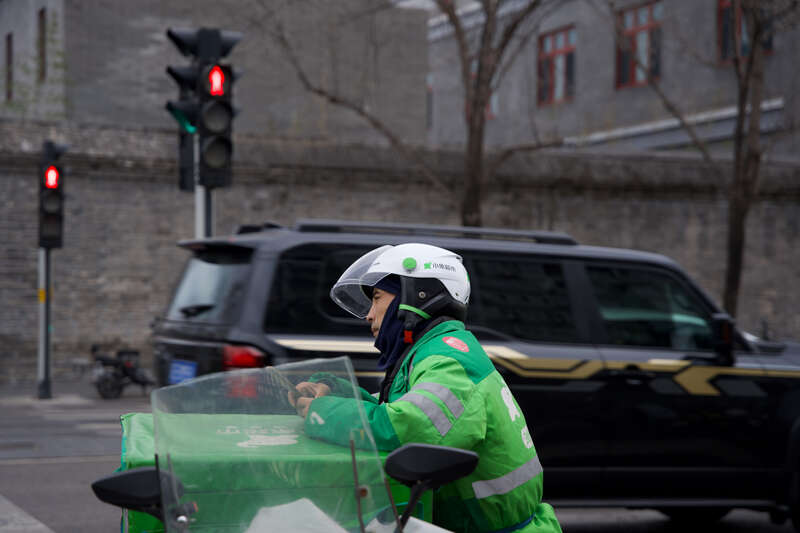 超市配送员在路口等待接货。