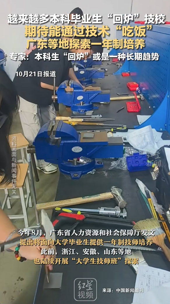 不妨看看,本科生技术“回炉”,回的是哪些“炉”?据媒体此前报道,太原万通职业技能学校电气自动化专业2023年招收的“回炉”学生约10人,2025年已增至30人,“回炉”学生以二本、三本院校毕业生为主。2025年秋季开学季,徐州工程机械技师学院迎来30多名持有大专、本科文凭的毕业生“回炉”,集中就读智能制造相关专业。
