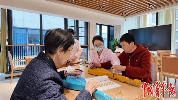 2025年12月22日,浙江省宁波市海曙区广安养怡院内,1999年出生的施银萍(右二)正在陪院内的老年人弹彩虹摇杆琴,这是一种专门为音乐疗愈活动设计的便携式乐器。中青报·中青网记者 刘昶荣/摄