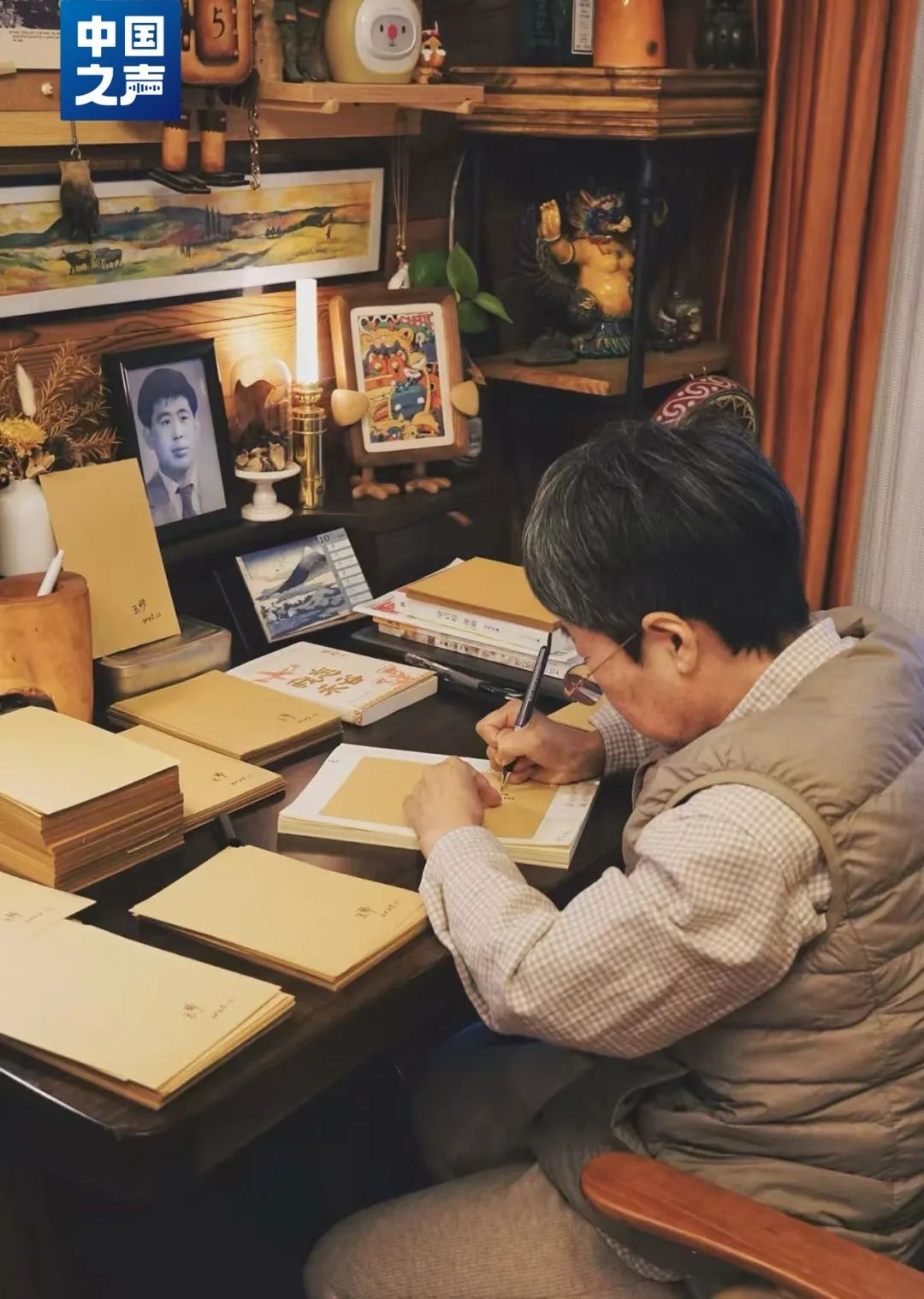 在家里那张书桌前,王玉珍写忙碌的母亲。无数个夜晚,昏黄的灯光下,母亲轻声哼唱着《四郎探母》或是《岳母刺字》,手里一刻不停地补袜子、纳鞋底。回忆起每年暑假结束,父亲总会撑着一把大伞在雨中送她离开家门。