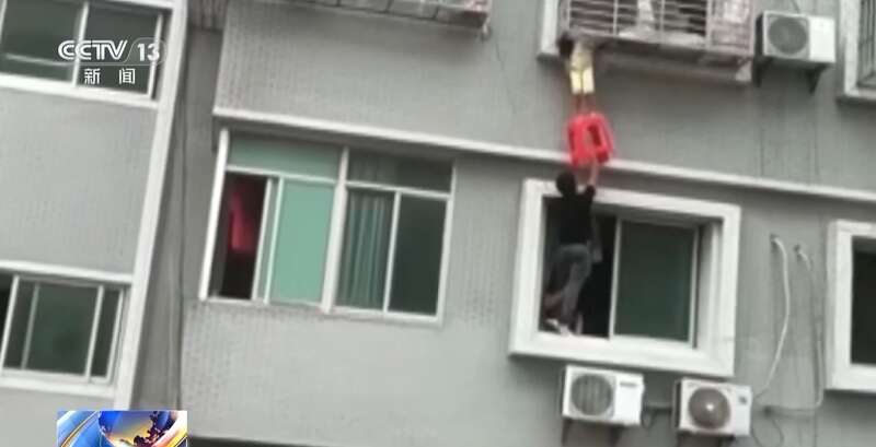 黄飞在下方持续用力向上顶,七楼的救援者奋力向上拉,这场上下协同的救援,持续了约十分钟。