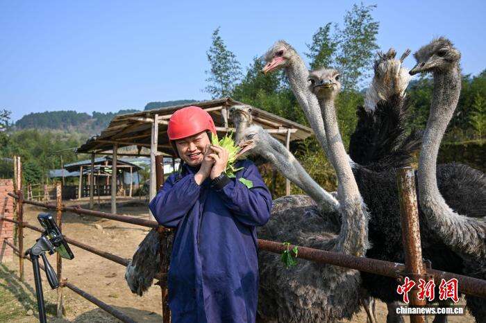近日,在重庆市万盛经济技术开发区关坝镇的鸵鸟养殖基地,范志亨戴着红色头盔,边喂鸵鸟边直播。“鸵鸟在网上关注度很高,开播不久就有人围观,有人戏称其为‘大长腿’。”范志亨说,他目前有6个主要账号,直播团队有7人,最多时一天卖出13只鸵鸟。